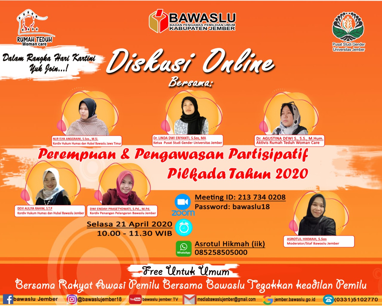 Hai #Sahabatbawaslu Dalam Rangka Memperingati Hari Kartini yang tepat pada tanggal 21 April 2020. Bawaslu Kabupaten Jember ngadain Diskusi Online dengan Tema Perempuan dan Pengawasan Partisipatif Pilkada Tahun 2020.